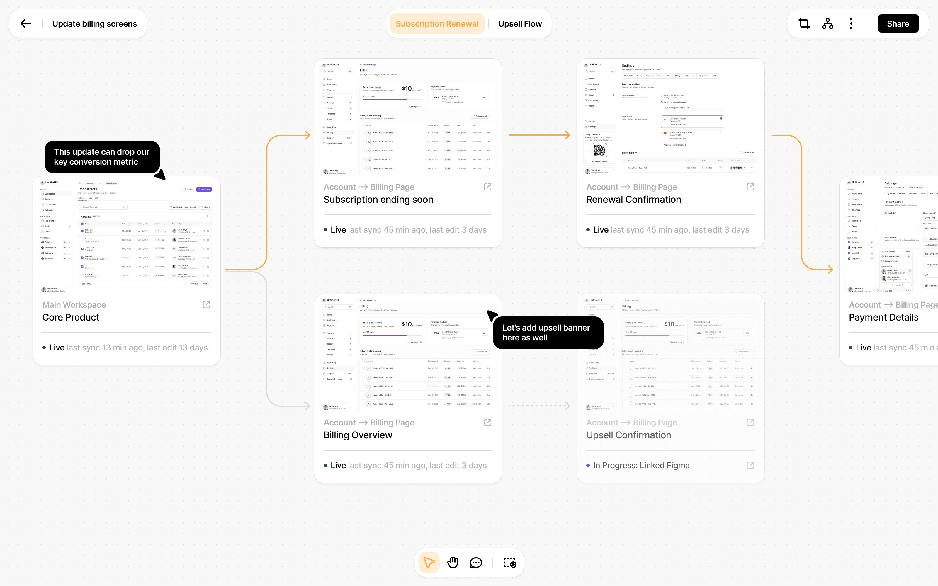 Handrail is a live UX map and shared decision canvas that shows what shipped, what’s live, and what’s changing next across screens, states, and apps.